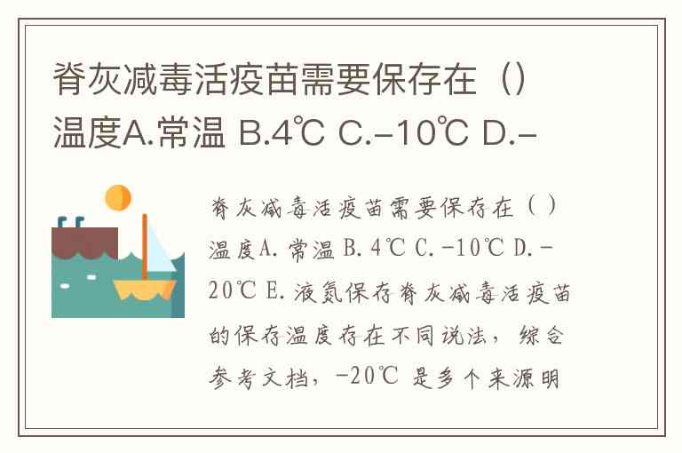 脊灰减毒活疫苗的保存温度存在不同说法,综合参考文档,-20℃ 是多个来源明确提及的标准条件。部分资料提到2-8℃可作为短期储存温度,但核心长期保存要求为-20℃以下,如脊髓灰质炎减毒活疫苗(糖丸)明确要求此温度以保持病毒活性。而-10℃、4℃等温度多为特定场景下的短期条件,常温或液氮保存则不符合规范。