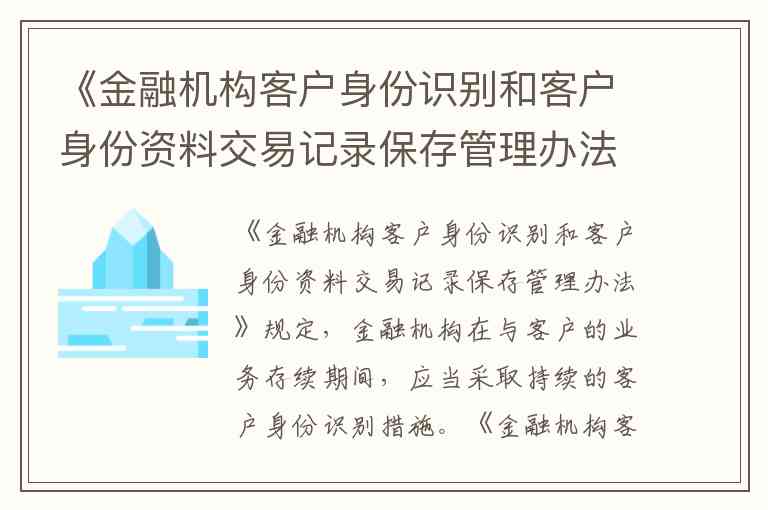《金融机构客户身份识别和客户身份资料交易记录保存管理办法》规定,金融机构在与客户的业务存续期间,应当采取持续的客户身份识别措施。