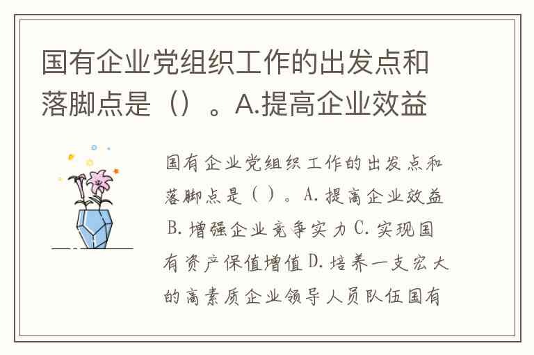 国有企业党组织工作的出发点和落脚点是()。A.提高企业效益 B.增强企业竞争实力 C.实现国有资产保值增值 D.培养一支宏大的高素质企业领导人员队伍