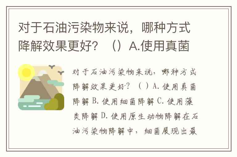 对于石油污染物来说,哪种方式降解效果更好?()A.使用真菌降解 B.使用细菌降解 C.使用藻类降解 D.使用原生动物降解