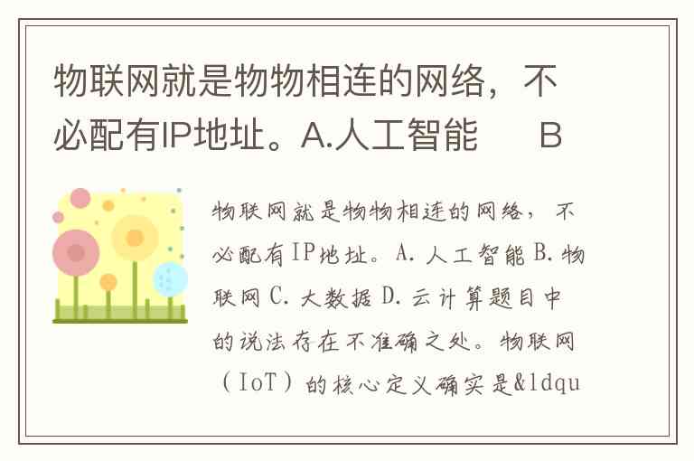 题目中的说法存在不准确之处。物联网(IoT)的核心定义确实是“物物相连的网络”,强调物理设备通过网络实现互联互通与数据交互。但“不必配有IP地址”这一表述并不严谨——大多数物联网设备需要IP地址进行通信,只是地址形式和分配方式存在多样性。