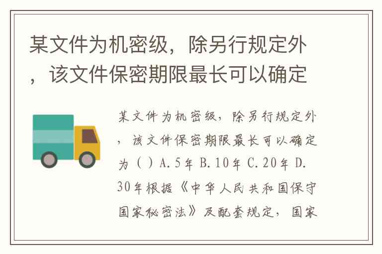 某文件为机密级,除另行规定外,该文件保密期限最长可以确定为()A.5年 B.10年 C.20年 D.30年