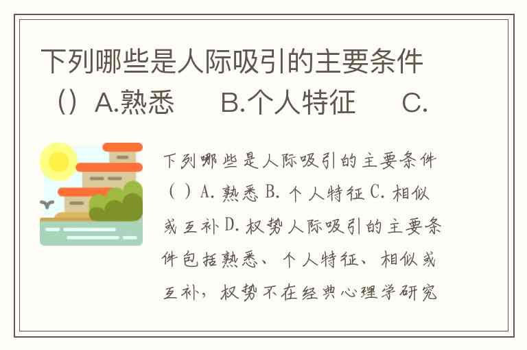人际吸引的主要条件包括熟悉、个人特征、相似或互补,权势不在经典心理学研究界定的核心因素范围内。以下是基于社会心理学研究的具体分析: