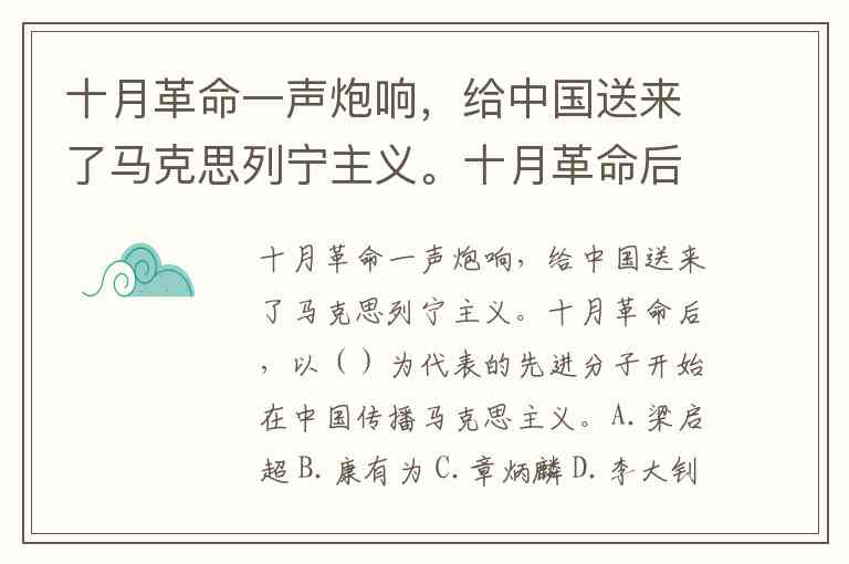 十月革命一声炮响,给中国送来了马克思列宁主义。十月革命后,以()为代表的先进分子开始在中国传播马克思主义。A.梁启超 B.康有为 C.章炳麟 D.李大钊