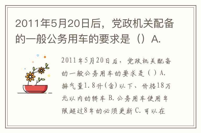 2011年5月20日后,党政机关配备的一般公务用车的要求是()A.排气量1.8升(含)以下、价格18万元以内的轿车 B.公务用车使用年限超过8年的必须更新 C.可以在不违反排气量标准情况下,配备进口车 D.国内生产且同类型车辆价格最便宜