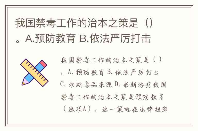 我国禁毒工作的治本之策是预防教育(选项A)。这一策略在法律框架与政策实践中均有明确体现,《中华人民共和国禁毒法》第四条确立了“预防为主,综合治理,禁种、禁制、禁贩、禁吸并举”的方针,而《全民禁毒教育实施意见》更直接指出,“广泛深入地开展禁毒教育,提高全民禁毒意识和抵制毒品能力,是禁毒工作的治本之策”。
