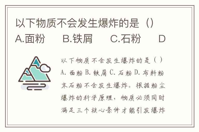 以下物质不会发生爆炸的是()A.面粉 B.铁屑 C.石粉 D.布料粉末