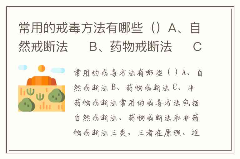 常用的戒毒方法包括自然戒断法、药物戒断法和非药物戒断法三类,三者在原理、适用性和效果上各有特点。