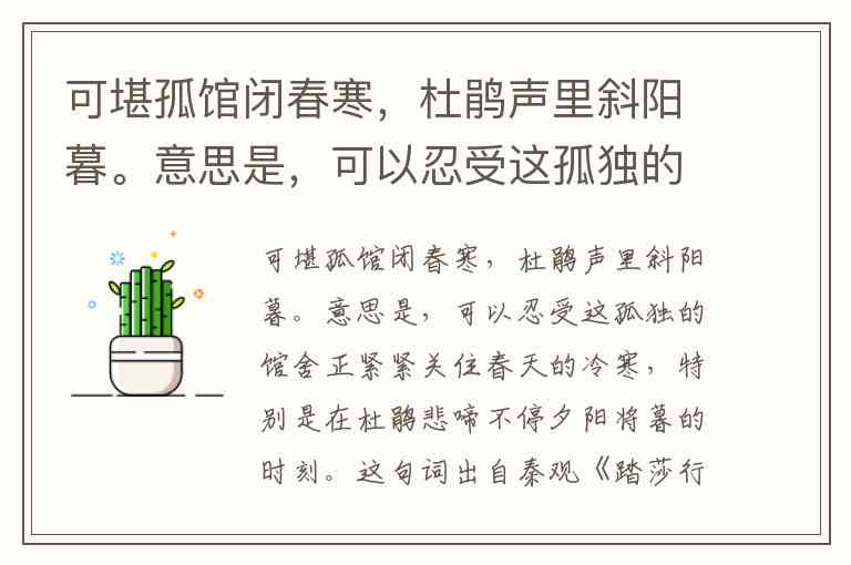可堪孤馆闭春寒,杜鹃声里斜阳暮。意思是,可以忍受这孤独的馆舍正紧紧关住春天的冷寒,特别是在杜鹃悲啼不停夕阳将暮的时刻。
