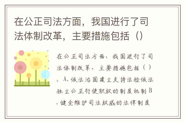 我国司法体制改革围绕公正司法目标推出多项关键举措,涵盖司法权运行机制、机构设置和诉讼制度等核心领域。以下为主要措施解析: