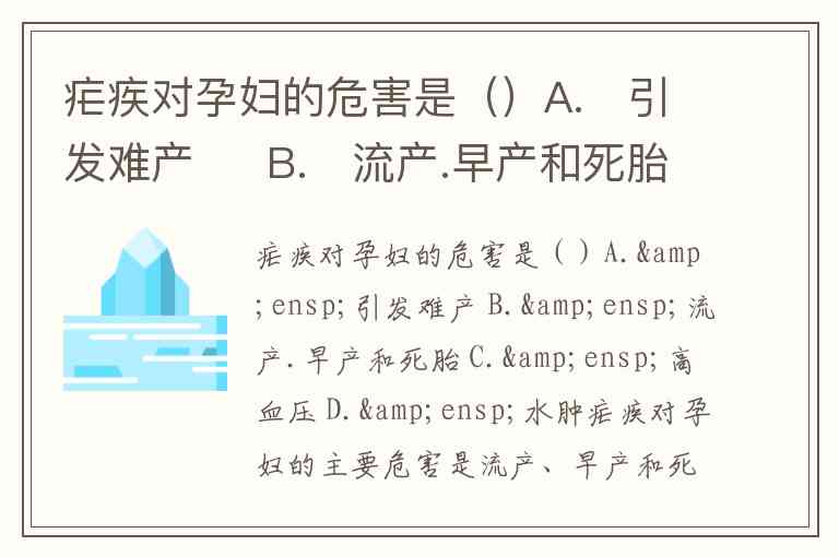 疟疾对孕妇的危害是()A. 引发难产 B. 流产.早产和死胎 C. 高血压 D. 水肿