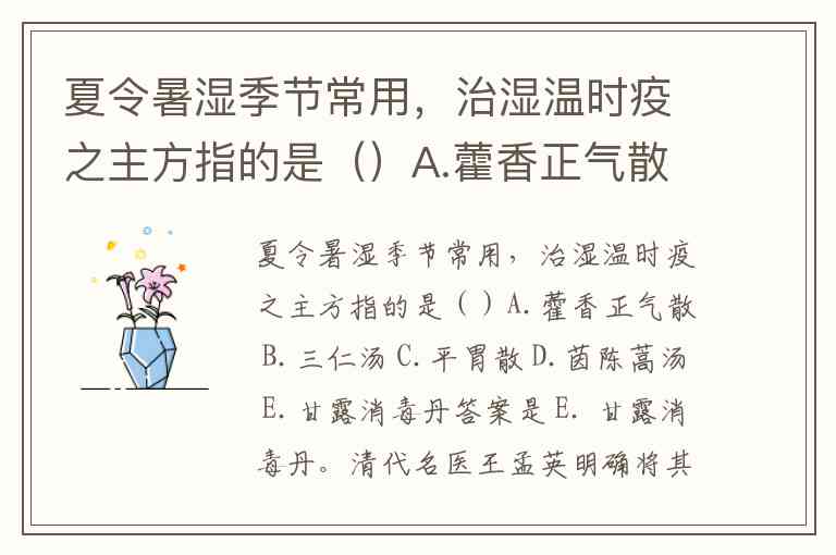 夏令暑湿季节常用,治湿温时疫之主方指的是()A.藿香正气散 B.三仁汤 C.平胃散 D.茵陈蒿汤 E.甘露消毒丹