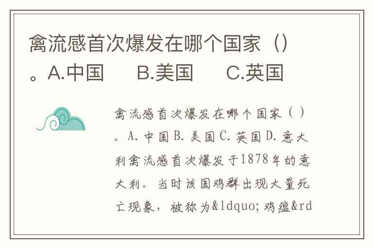 禽流感首次爆发在哪个国家()。A.中国 B.美国 C.英国 D.意大利