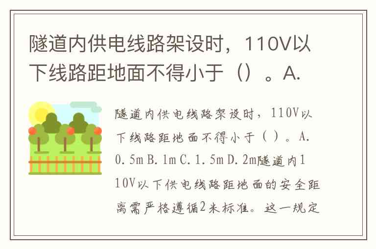隧道内供电线路架设时,110V以下线路距地面不得小于()。A.0.5m B.lm C.1.5m D.2m