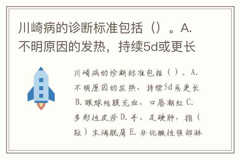川崎病的诊断标准包括()。A.不明原因的发热,持续5d或更长 B.眼球结膜充血,口唇潮红 C.多形性皮疹 D.手、足硬肿,指(趾)末端脱屑 E.非化脓性颈部淋巴结肿大