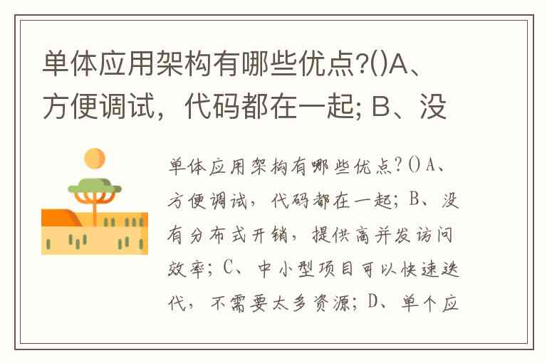 单体应用架构有哪些优点?()A、方便调试,代码都在一起; B、没有分布式开销,提供高并发访问效率; C、中小型项目可以快速迭代,不需要太多资源; D、单个应用,易于部署和维护 此题为多项选择题。