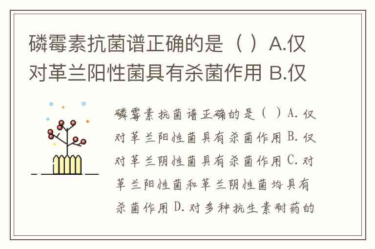 磷霉素抗菌谱正确的是( )A.仅对革兰阳性菌具有杀菌作用 B.仅对革兰阴性菌具有杀菌作用 C.对革兰阳性菌和革兰阴性菌均具有杀菌作用 D.对多种抗生素耐药的葡萄球菌无抗菌活性 E.对铜绿假单胞菌无效