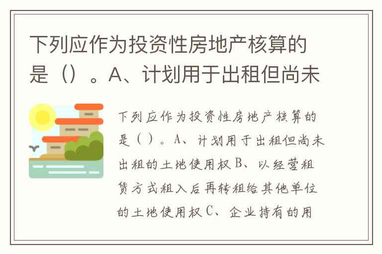 下列应作为投资性房地产核算的是()。A、计划用于出租但尚未出租的土地使用权 B、以经营租赁方式租入后再转租给其他单位的土地使用权 C、企业持有的用于建造办公楼的土地使用权 D、以转让方式取得后再经营租赁出租的土地使用权