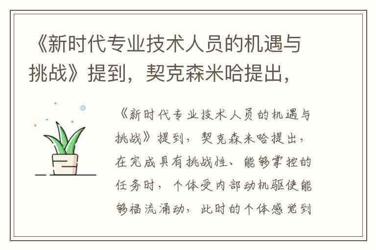 《新时代专业技术人员的机遇与挑战》提到,契克森米哈提出,在完成具有挑战性、能够掌控的任务时,个体受内部动机驱使能够福流涌动,此时的个体感觉到全神贯注和高度的忘我,甚至时间知觉都会被拉长,而且往往伴随着高峰体验。这就是关于()的解释。