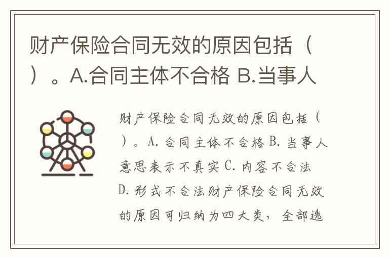 财产保险合同无效的原因可归纳为四大类,全部选项均符合法律规定。根据《合同法》《保险法》及司法实践,合同主体资格、意思表示真实性、内容合法性及形式合规性是判定合同效力的核心要件。