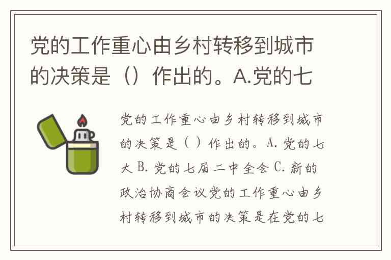 党的工作重心由乡村转移到城市的决策是()作出的。A.党的七大 B.党的七届二中全会 C.新的政治协商会议
