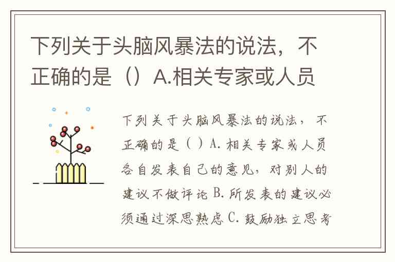 下列关于头脑风暴法的说法,不正确的是()A.相关专家或人员各自发表自己的意见,对别人的建议不做评论 B.所发表的建议必须通过深思熟虑 C.鼓励独立思考、奇思妙想 D.可以补充完善已有的建议
