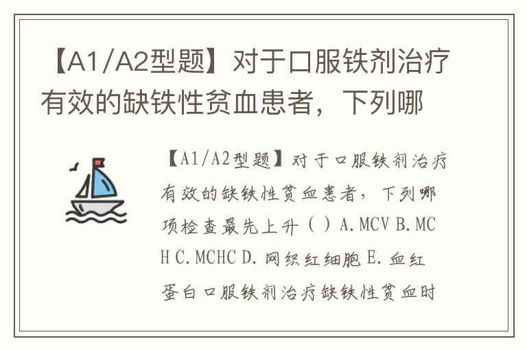 【A1/A2型题】对于口服铁剂治疗有效的缺铁性贫血患者,下列哪项检查最先上升()A.MCV B.MCH C.MCHC D.网织红细胞 E.血红蛋白