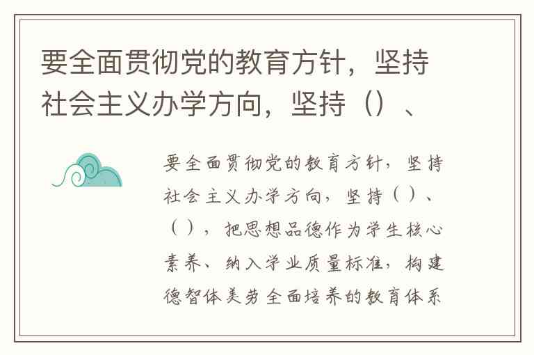 要全面贯彻党的教育方针,坚持社会主义办学方向,坚持教育为社会主义现代化建设服务、为人民服务,把思想品德作为学生核心素养、纳入学业质量标准,构建德智体美劳全面培养的教育体系。这一表述源自新时代党的教育方针的核心内容,其中“两个服务”明确了教育的根本宗旨,即教育既要支撑国家发展战略,又要回应人民对优质教育的需求。将思想品德纳入核心素养,正是落实“立德树人”根本任务的具体体现,与培养“德智体美劳全面发展的社会主义建设者和接班人”的目标高度契合。
