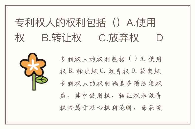 专利权人的权利涵盖多项法定权益,其中使用权、转让权和放弃权均属于核心权利范畴,而获奖权并非法律规定的专利权内容。