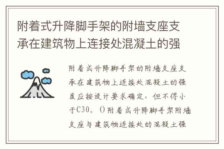 附着式升降脚手架附墙支座与建筑物连接处的混凝土强度要求并非固定为C30,而需根据具体规范和设计条件确定。根据《建筑施工工具式脚手架安全技术规范》(JGJ202-2010),混凝土强度应按设计要求确定,但最低限值存在不同规范表述:部分考试题库及技术资料显示不得小于C10或C20,如某专业实务题库明确选项中正确答案为C10 ,而另一技术文献在螺栓孔混凝土局部承压计算中直接采用C20强度标准(f=13.4N/mm²)进行验算 。这种差异可能源于不同场景下的受力条件——常规附着或临时固定可能允许较低强度,而承受较大剪力或局部压力时则需更高等级混凝土 。