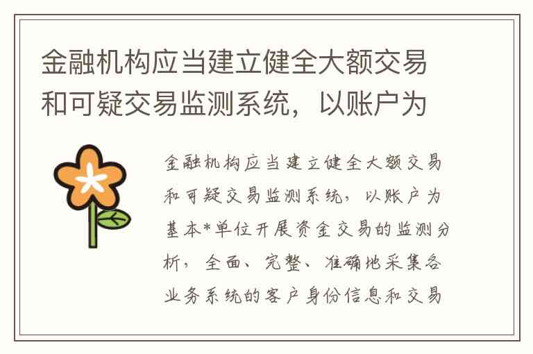 金融机构应当建立健全大额交易和可疑交易监测系统,以账户为基本*单位开展资金交易的监测分析,全面、完整、准确地采集各业务系统的客户身份信息和交易信息,保障大额交易和可疑交易监测分析的数据需求。