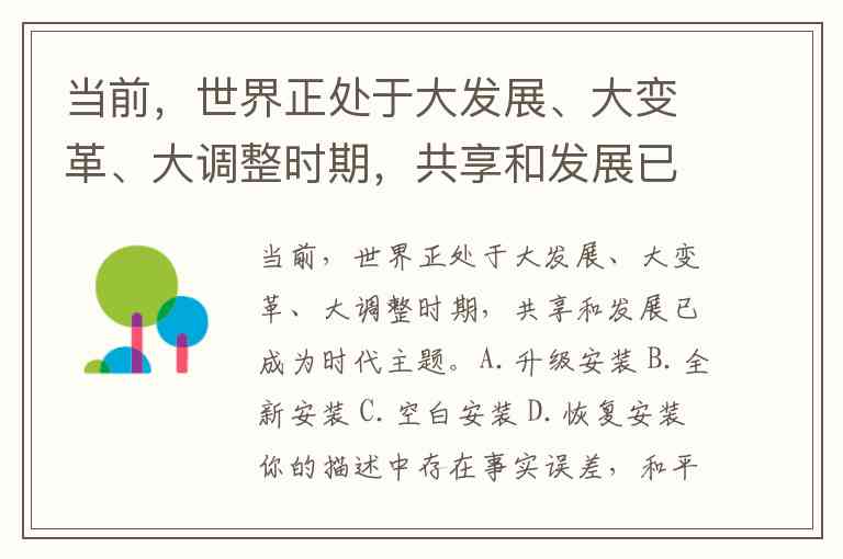 当前,世界正处于大发展、大变革、大调整时期,共享和发展已成为时代主题。A.升级安装 B.全新安装 C.空白安装 D.恢复安装
