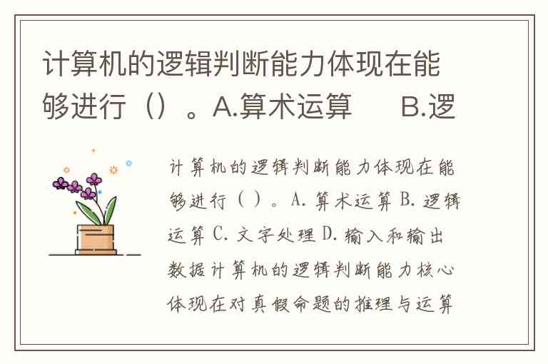 计算机的逻辑判断能力体现在能够进行()。A.算术运算 B.逻辑运算 C.文字处理 D.输入和输出数据