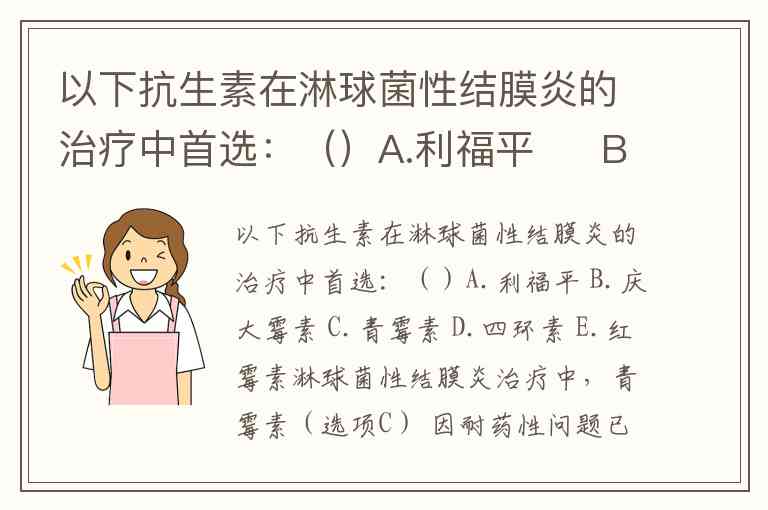 以下抗生素在淋球菌性结膜炎的治疗中首选:()A.利福平 B.庆大霉素 C.青霉素 D.四环素 E.红霉素