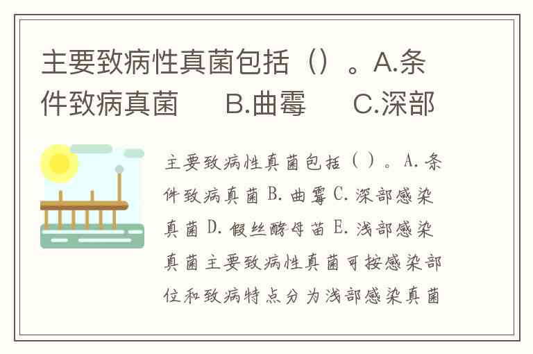 主要致病性真菌包括()。A.条件致病真菌 B.曲霉 C.深部感染真菌 D.假丝酵母苗 E.浅部感染真菌