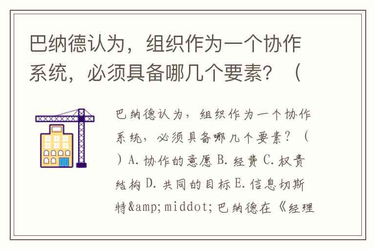 巴纳德认为,组织作为一个协作系统,必须具备哪几个要素?()A.协作的意愿 B.经费 C.权责结构 D.共同的目标 E.信息