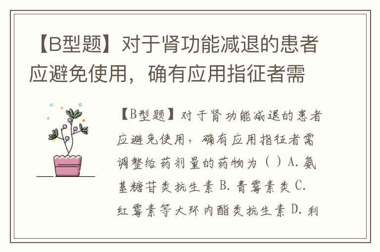 【B型题】对于肾功能减退的患者应避免使用,确有应用指征者需调整给药剂量的药物为()A.氨基糖苷类抗生素 B.青霉素类 C.红霉素等大环内酯类抗生素 D.利福平 E.头孢唑啉