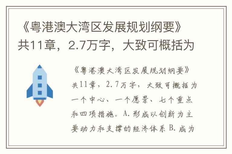 《粤港澳大湾区发展规划纲要》共11章,2.7万字,大致可概括为一个中心、一个愿景、七个重点和四项措施。A.形成以创新为主要动力和支撑的经济体系 B.成为改革开放的排头兵 C.扎实推进全面创新改革试验 D.建成全球科技创新高地和新兴产业重要策源地