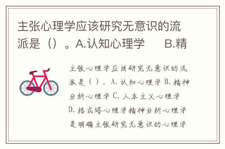 主张心理学应该研究无意识的流派是()。A.认知心理学 B.精神分析心理学 C.人本主义心理学 D.格式塔心理学
