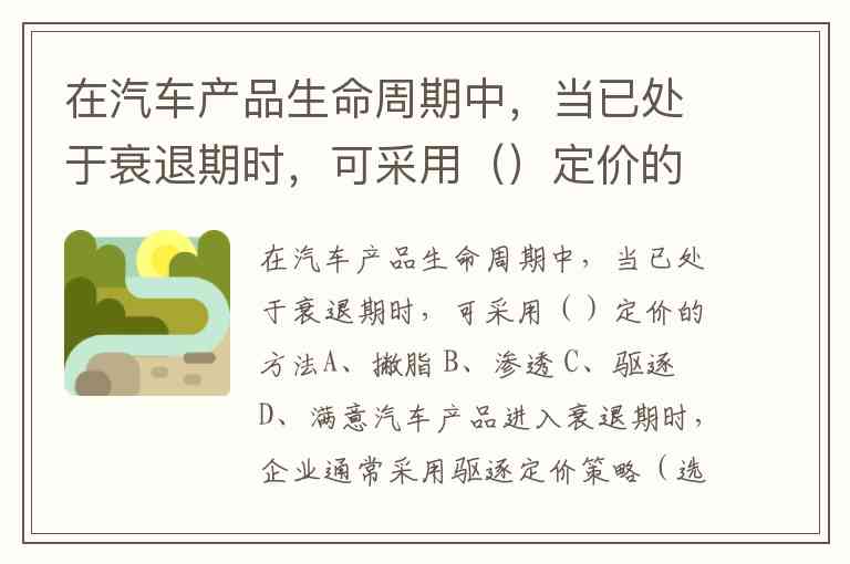 在汽车产品生命周期中,当已处于衰退期时,可采用()定价的方法A、撇脂 B、渗透 C、驱逐 D、满意