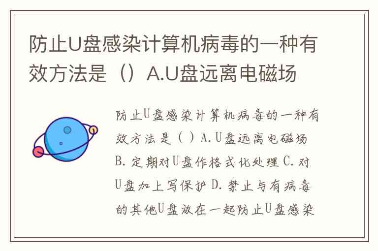 防止U盘感染计算机病毒的一种有效方法是()A.U盘远离电磁场 B.定期对U盘作格式化处理 C.对U盘加上写保护 D.禁止与有病毒的其他U盘放在一起