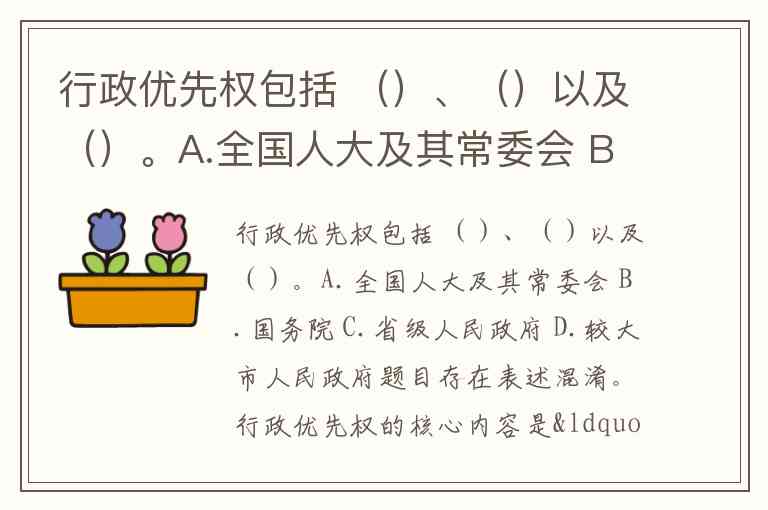 行政优先权包括 ()、()以及()。A.全国人大及其常委会 B.国务院 C.省级人民政府 D.较大市人民政府