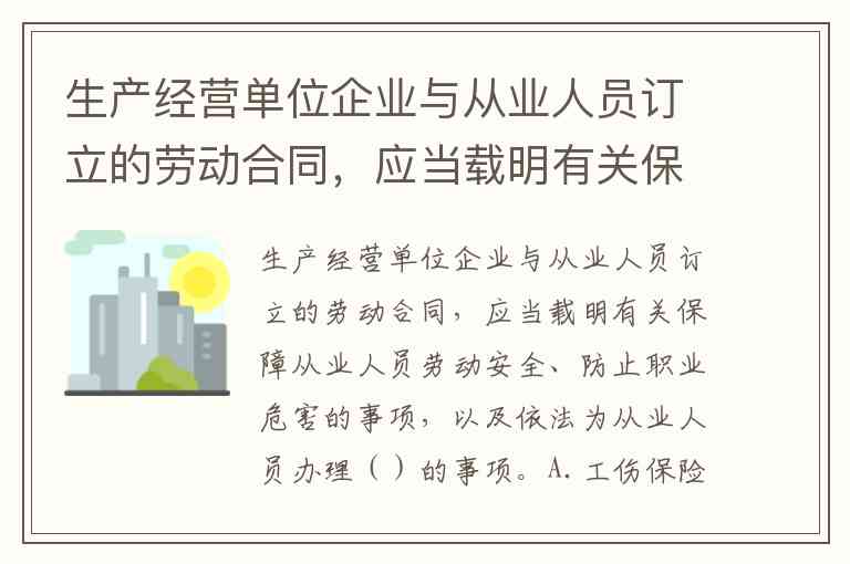 生产经营单位企业与从业人员订立的劳动合同,应当载明有关保障从业人员劳动安全、防止职业危害的事项,以及依法为从业人员办理()的事项。A.工伤保险 B.社会保险 C.工伤社会保险 D.失业保险