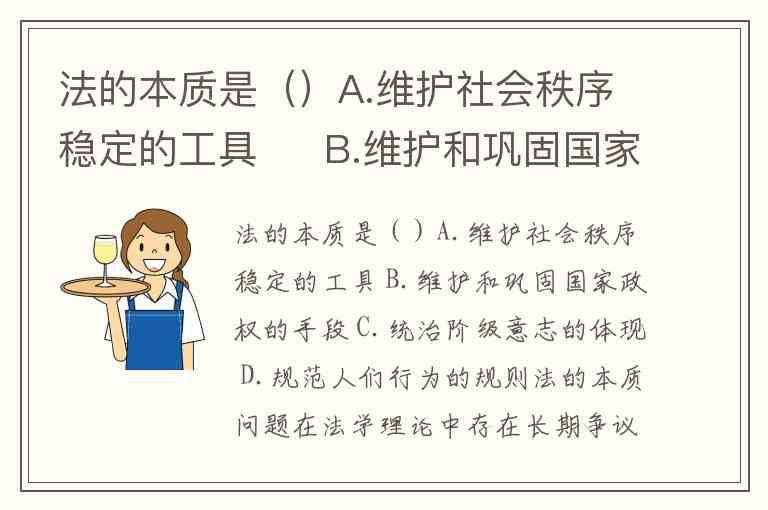法的本质是()A.维护社会秩序稳定的工具 B.维护和巩固国家政权的手段 C.统治阶级意志的体现 D.规范人们行为的规则