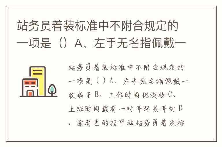 站务员着装标准中不附合规定的一项是()A、左手无名指佩戴一枚戒子 B、工作时间化淡妆 C、上班时间戴有一对耳环或耳钉 D、涂有色的指甲油