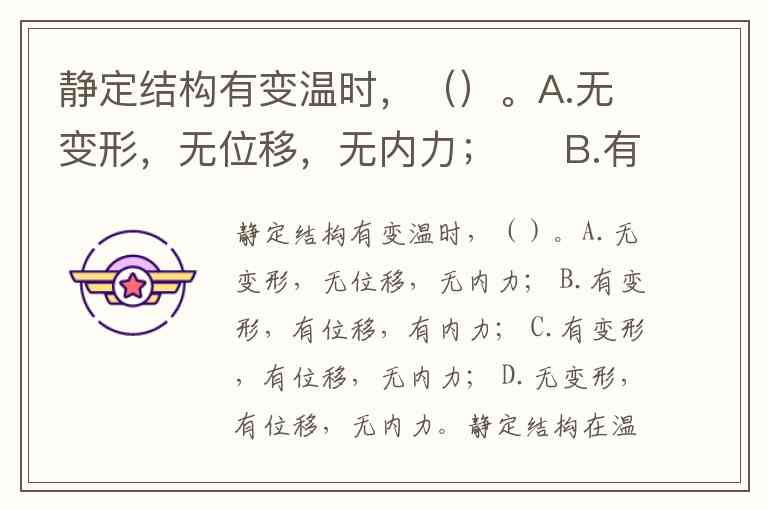 静定结构有变温时,()。A.无变形,无位移,无内力; B.有变形,有位移,有内力; C.有变形,有位移,无内力; D.无变形,有位移,无内力。