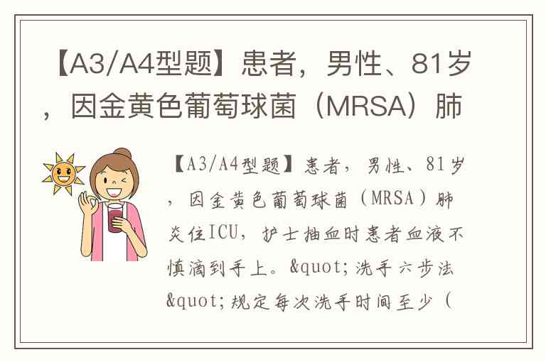 【A3/A4型题】患者,男性、81岁,因金黄色葡萄球菌(MRSA)肺炎住ICU,护士抽血时患者血液不慎滴到手上。"洗手六步法"规定每次洗手时间至少()A.5~10秒 B.15~20秒 C.25~30秒 D.35~40秒 E.45~50秒