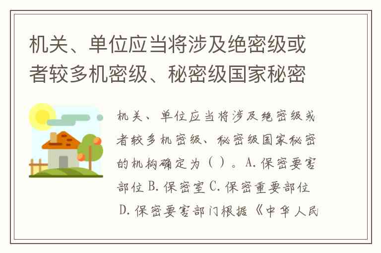 机关、单位应当将涉及绝密级或者较多机密级、秘密级国家秘密的机构确定为()。A.保密要害部位 B.保密室 C.保密重要部位 D.保密要害部门