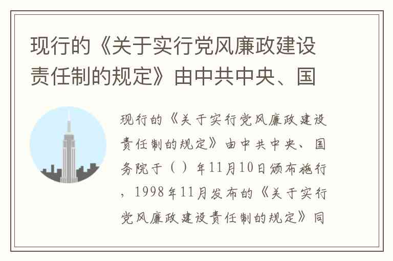 现行的《关于实行党风廉政建设责任制的规定》由中共中央、国务院于2010年11月10日修订后颁布施行,1998年11月发布的旧版规定同时废止。这一修订通过中央文件《中共中央国务院印发〈关于实行党风廉政建设责任制的规定〉的通知》(中发〔2010〕19号)正式确认,旨在强化领导班子和领导干部的反腐倡廉政治责任,为科学发展提供政治保障。修订后的《规定》作为党风廉政建设的基础性法规,明确了"谁主管、谁负责"原则,要求将反腐败工作与业务工作同部署、同落实,标志着中国管党治党制度的进一步完善。