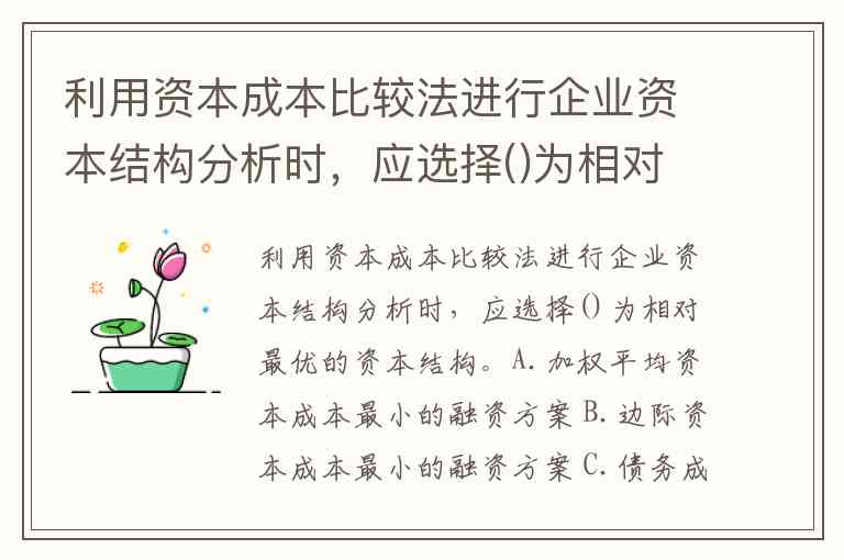 利用资本成本比较法进行企业资本结构分析时,应选择()为相对最优的资本结构。A.加权平均资本成本最小的融资方案 B.边际资本成本最小的融资方案 C.债务成本最小的融资方案 D.算数平均资本成本最小的融资方案